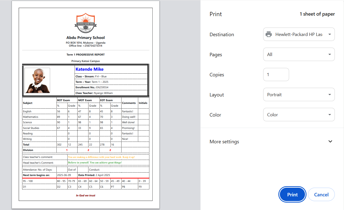 - Track student performance across terms, subjects, and classes.
